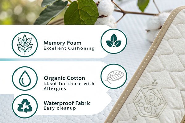 Use memory foam for cushioning, organic cotton for allergies, waterproof fabric for easy cleanup. These materials boost durability and health benefits.